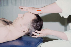 et droite empaument l'occipital, les médius au contact de la ligne occipitale.